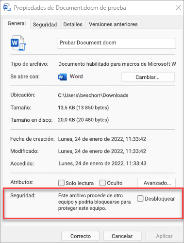 que el archivo está desbloqueado en Windows